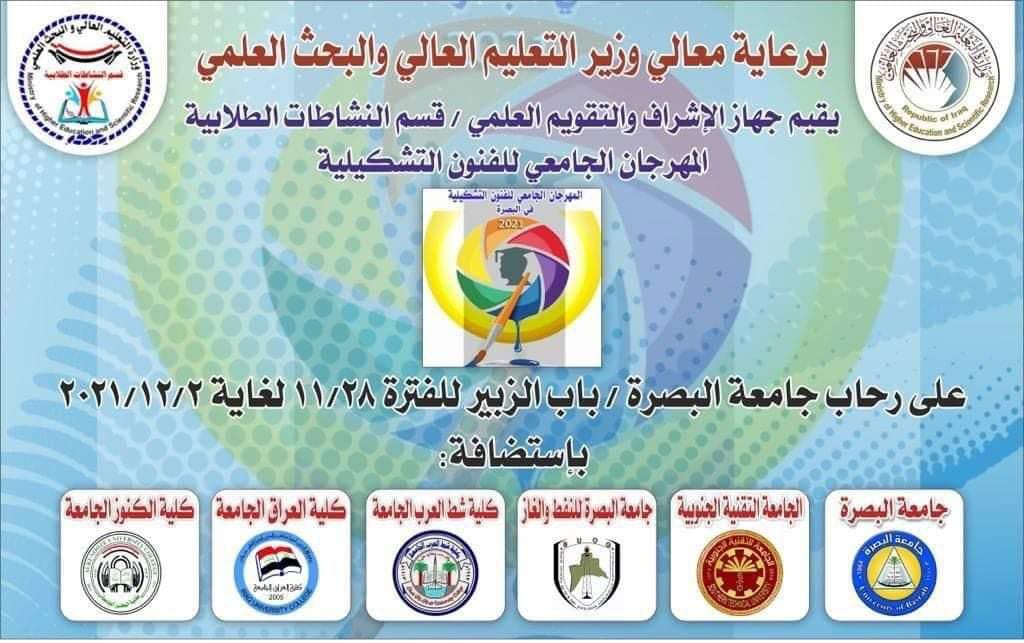 **الجامعة التقنية الجنوبية تشارك بإستضافة مهرجان الفنون التشكيلية للجامعات العراقية** شاركت الجامعة التقنية الجنوبية بإستضافة مهرجان الفنون التشكيلية للجامعات العراقية بالإضافة الى جامعة البصرة والجامعة التقنية الجنوبية وجامعة النفط والغاز وكلية شط العرب وكلية الكنوز والجامعة العراقية ، المهرجان الذي أقامه قسم النشاطات الطلابية في جهاز الإشراف بوزارة التعليم وضمن منهاجه السنوي لهذا العام تضمن مسابقة الرسم الفردية ومسابقة الإنشاء الفني الجماعية التي تهدف الى تنمية الروابط الاجتماعية وتعزيز التعاون بين الطلبة من خلال الرسم الحر ، لإنتاج عمل فني معبر يظهر مهرات الطلبة التشكيلية فضلا عن معرض اللوحات والأعمال الفنية التشكيلية المشتركة . ويذكر ان الجامعة شاركت في هذا المهرجان بعدد من طلبتها من مختلف تشكيلاتها . على صعيد متصل تسلم رئيس الجامعة الأستاذ الدكتور ربيع هاشم ثجيل العباسي من مدير قسم النشاطات الطلابية الدكتور مناف حسين عودة درع المشاركة تثميناً لدور الجامعة في هذه الفعاليات المميزة .