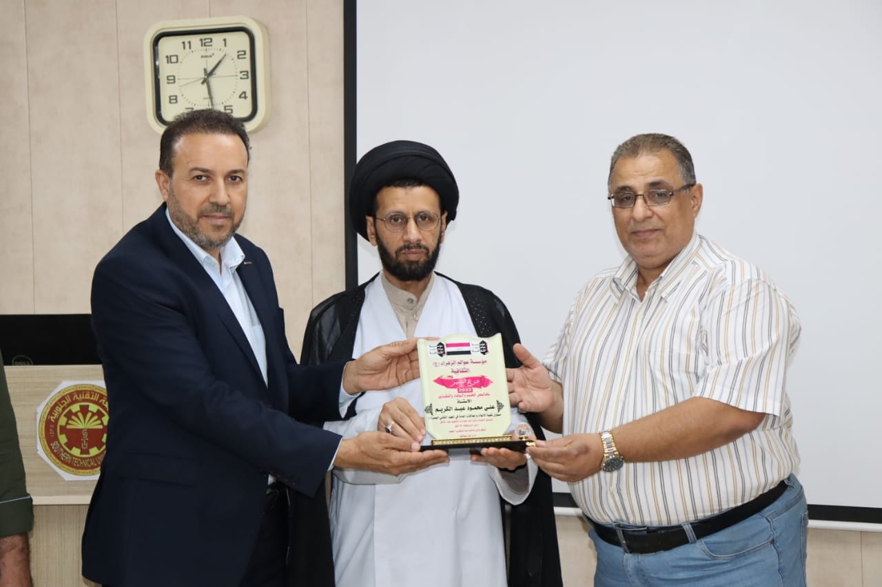 وفد مكون من رئيس واعضاء مؤسسة عوالم الزهراء الثقافية يقدمون درع التميز لمسؤول شعبة الاعلام والعلاقات العامة في المعهد التقني البصرة السيد علي محمود ولذلك للعمل المشترك بتقديم المساعدات المادية والمعنوية لعوائل الشهداء والجرحى والايتام والذي استمر على مدى سنوات بين طلبة المعهد والمؤسسة .
