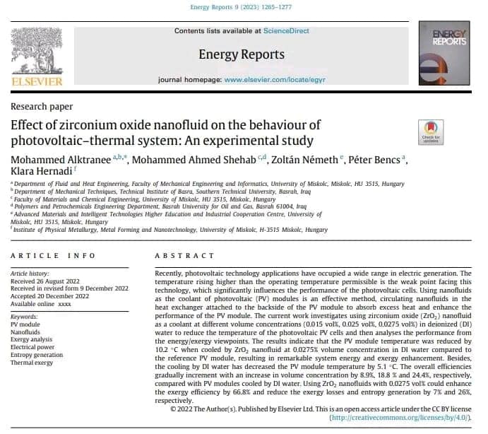 بحث مشترك تم نشرة مؤخرا في مجلة علمية محكمه ضمن مستوعبات سكوبس الربع الاول Q1 وذات معامل تأثير 4.9 من قبل طالب الدكتوراه التدريسي في قسم التقنيات الميكانيكية محمد حميد راضي ركز البحث على تحسين كفاءة الالواح الشمسية وتقليل الخسائر في القدرة الناتجة . جميع اختبارات البحث تمت في الظروف الحارة ، وتم خلالها تبريد الالواح الشمسية بموائع نانوية جديدة والتي ساعدت بشكل ملحوظ في خفض درجات الحرارة للخلايا الشمسية ورفع كفائتها.