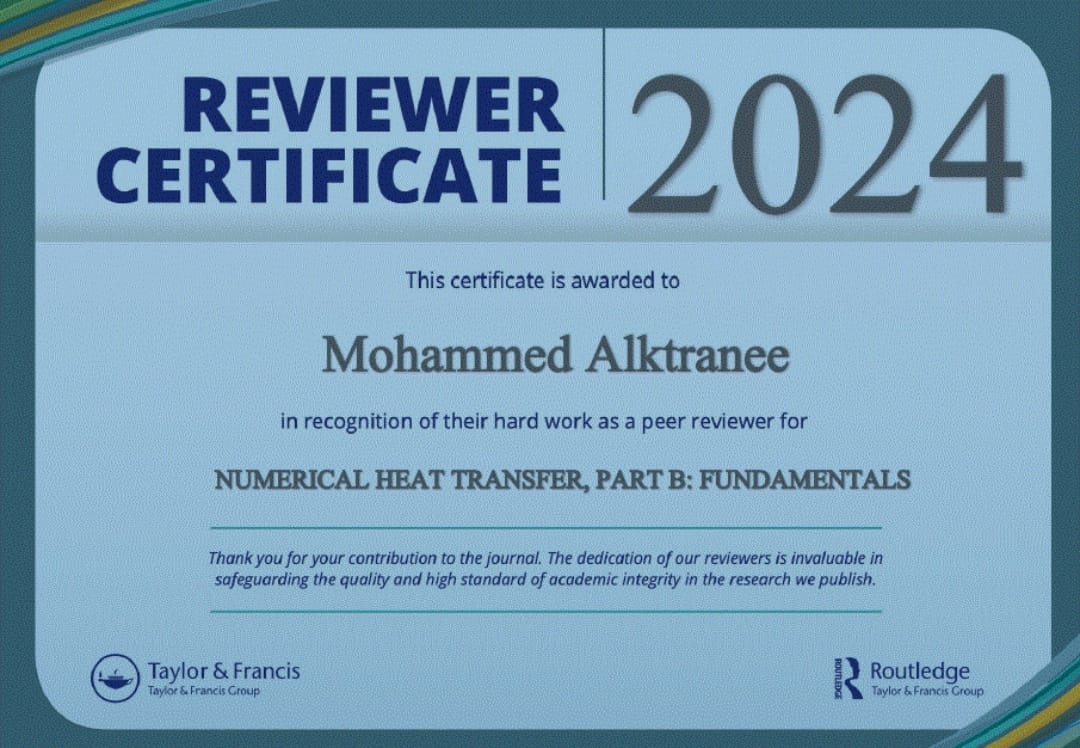 تم اختيار الدكتور محمد حميد راضي التدريسي في قسم التقنيات الميكانيكية في المعهد التقني البصرة كمقيم علمي لمجلة (Numerical Heat Transfer, Part B: Fundamentals) لمراجعة وتقييم مقالة علمية تحت عنوان (Efficient cooling system design by using different shaped nanoparticles and rotating cylinders in channel system for photovoltaic thermal management”) البحث الذي تم تقييمة تابع لمجلة Taylor and Francis .